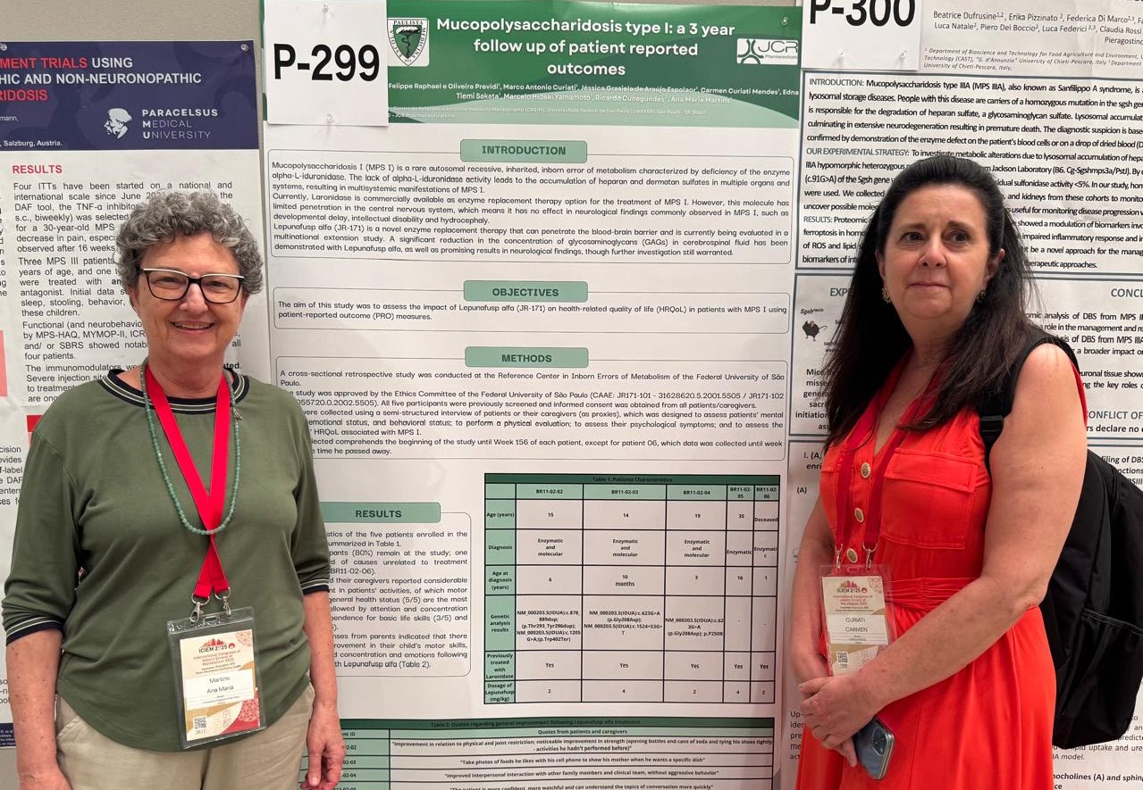 Dra. Ana Maria e Dra. Carmen, apresentam no congresso o poster dos dados clínicos do estudo de MPSI com o medicamento que cruza a barreira hematoencefálica.